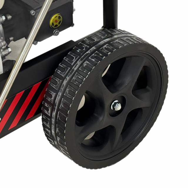 • Robuust ontwerp: gepoedercoat stalen frame met grote rubberen wielen – stabiel en terreinwaardig